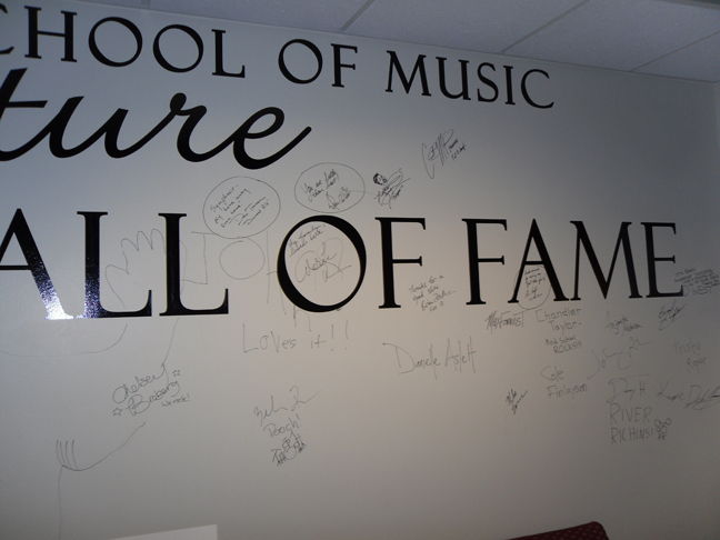 Here are pics of our Wall of Fame. We invite famous people and our students and instructors to sign the wall. Signatures we have include Marie Osmond, Big Buddah (Fox 13 news anchor), Jon Schmidt (local pianist), Court "The Crusher" McGee (Tuf 11 Winner), Nathan Osmond (singer/songwriter), Dan Truman (Diamond Rio band), Guy Golightly (This Is Your Band), Melanie Shore (Collin Raye), Bogie Bowles (Joe Bonamassa band & yamaha).